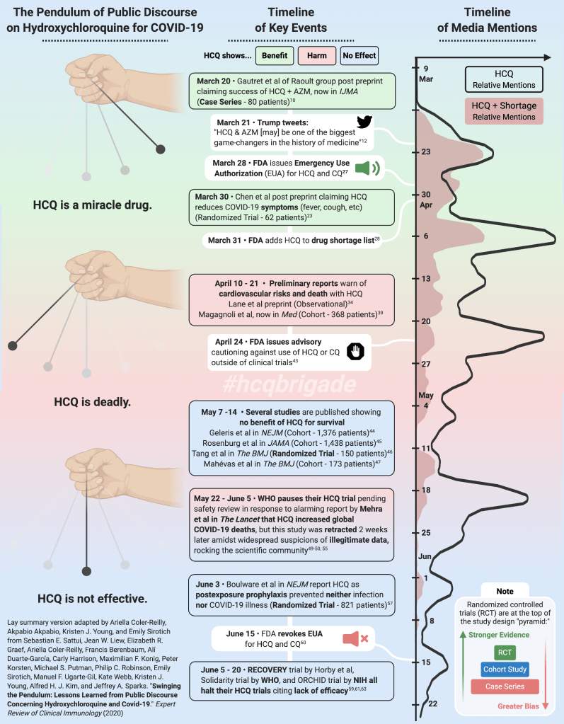 I created the graphic using a mixture of BioRender and Adobe Illustrator. It was published in the Expert Review of Clinical Immunology as part of the #HCQBrigade review article, “Swinging the pendulum: lessons learned from public discourse concerning hydroxychloroquine and COVID-19.” The article is open access, so anyone may click the link and download it for free.