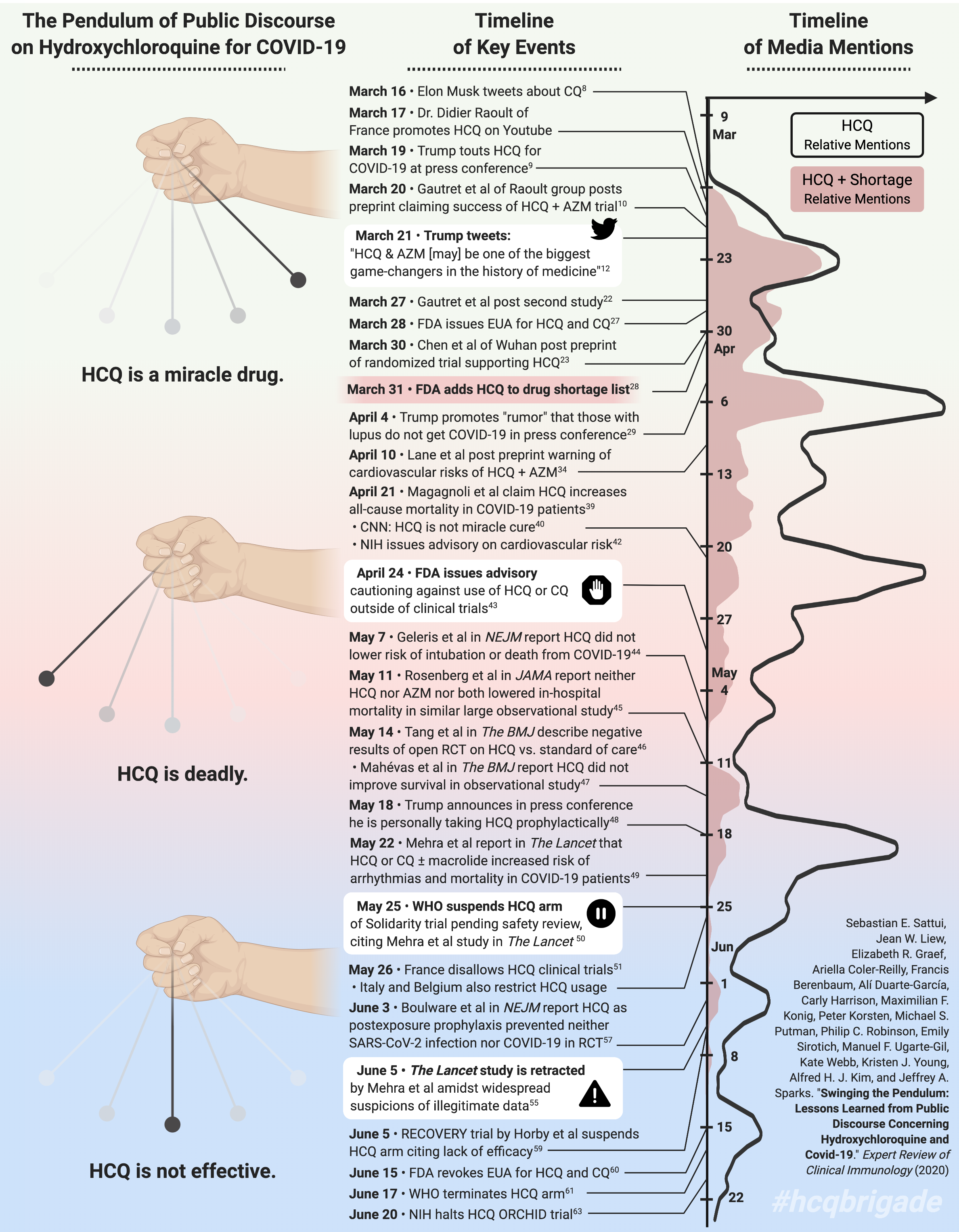 The timeline flows from top (early March) to bottom (late June). On the left, a swinging pendulum represents the overall trend of public discourse surrounding HCQ for COVID-19. Key events are listed in the middle column (see full text for references). On the right is a quantitative view of how much HCQ was mentioned in the media, showing how spikes correspond to certain key events.