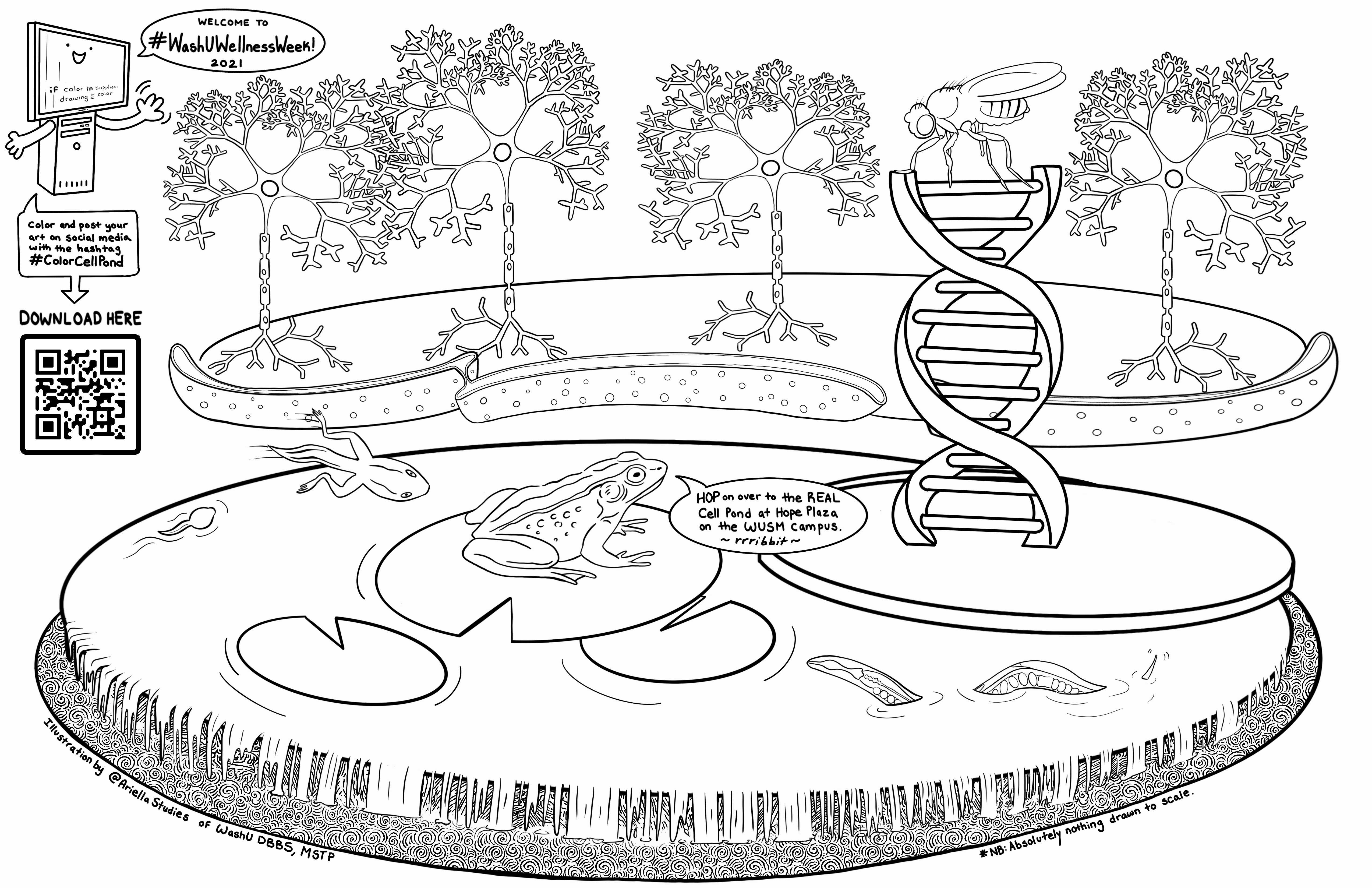 Color away your stress with this illustration extrapolated from the famous Hope Plaza, colloquially known as Cell Pond for its very distinctive shape. Don’t forget to post your colorful renditions on social media with the hashtag #ColorCellPond. Happy Wellness Week!