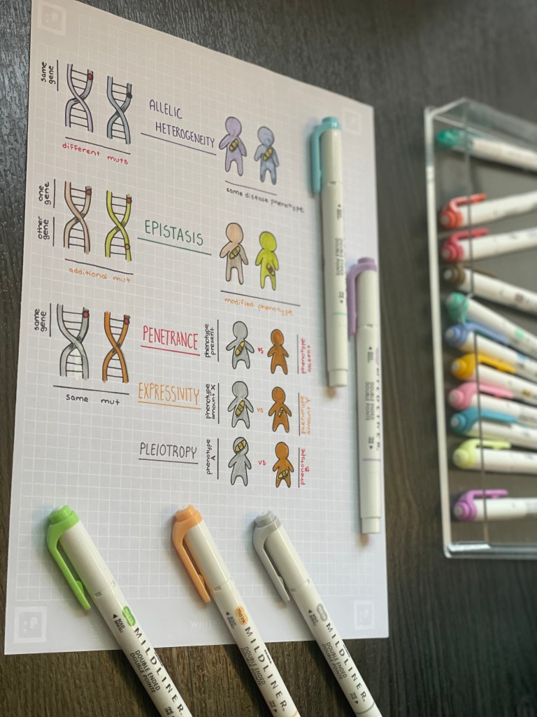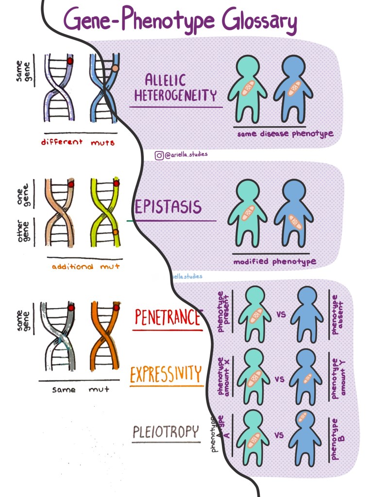There are a lot of terms for gene-phenotype interactions in genetics, and it can be very confusing! So I made this handy visual guide explaining the subtle differences between the terms allelic heterogeneity, epistasis, penetrance, expressivity, and pleiotropy! Please feel free to save it and share it with your classmates and colleagues — we are all in this together! #FOAMed